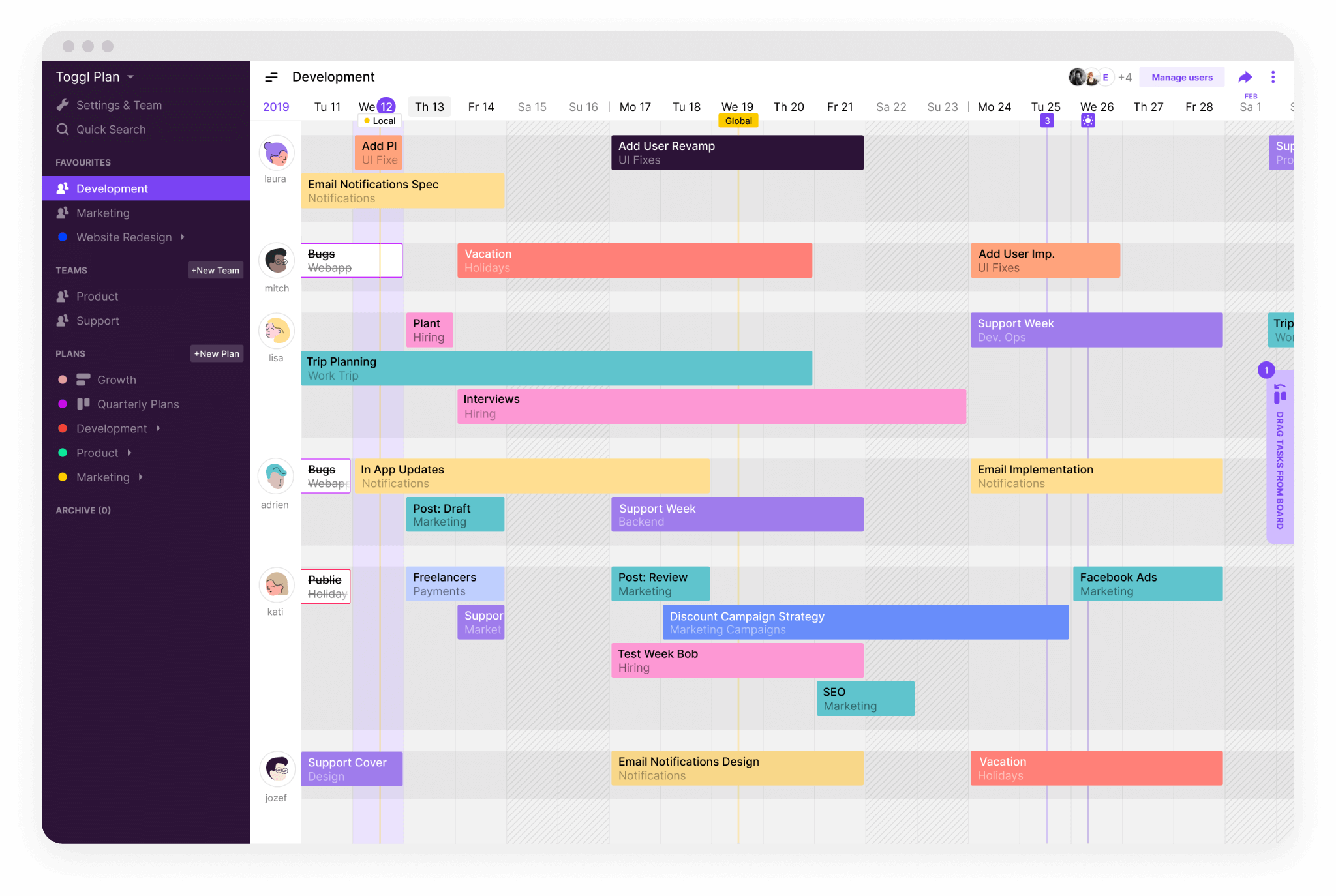 Delivering creative projects involves a lot of moving pieces. Spreadsheets are unreliable, and keeping project tools up to date can feel like a chore. With Toggl Plan, you can plan, prioritize, and track projects using simple, drag and drop timelines.