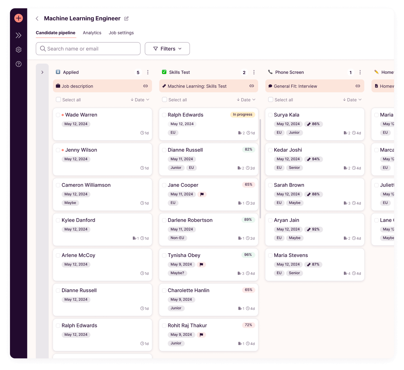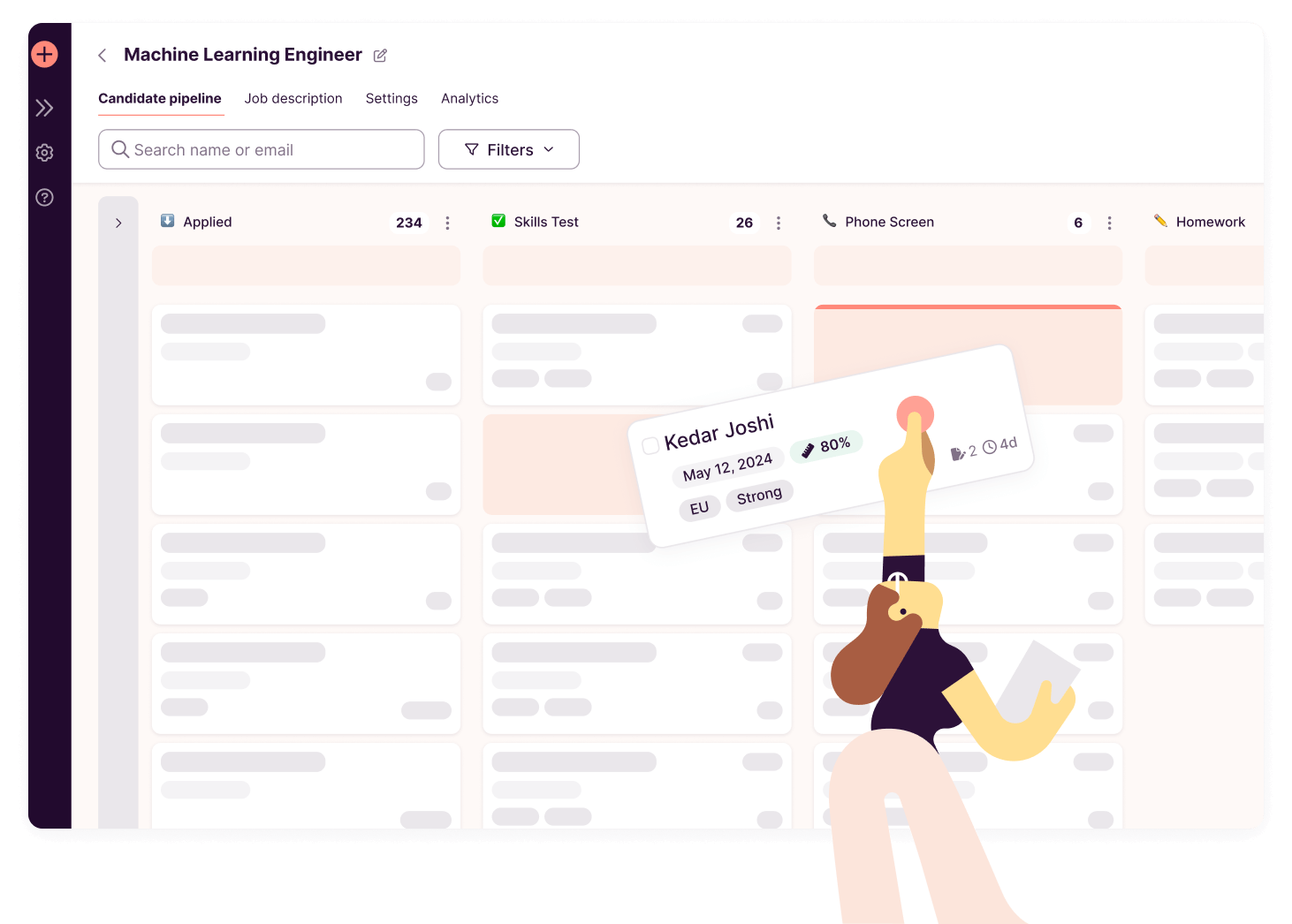 We’ll drop you into a pipeline based on your needs and the role you’re hiring for. Drag and drop hiring stages to fully customize your candidate pipeline.
