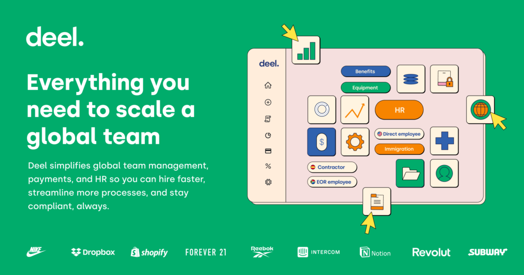 • Deel: Deel is the ultimate platform for global team management, offering an all-in-one software solution to manage payroll, immigration, and HR of your remote teams. It also helps you stay compliant with local laws and regulations.