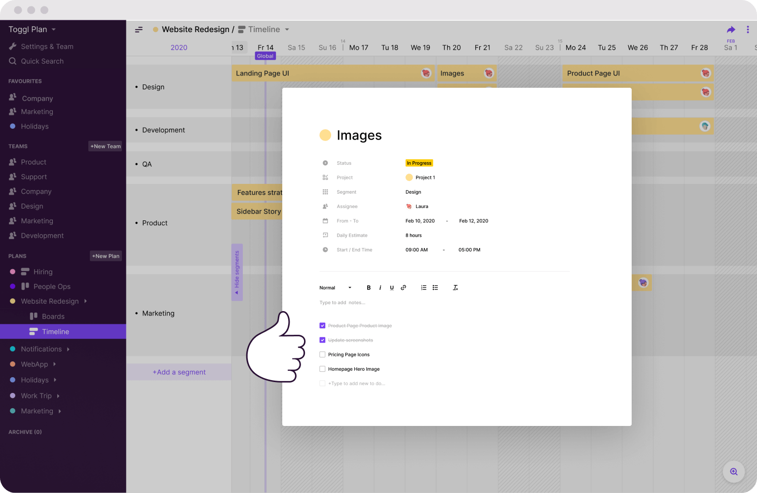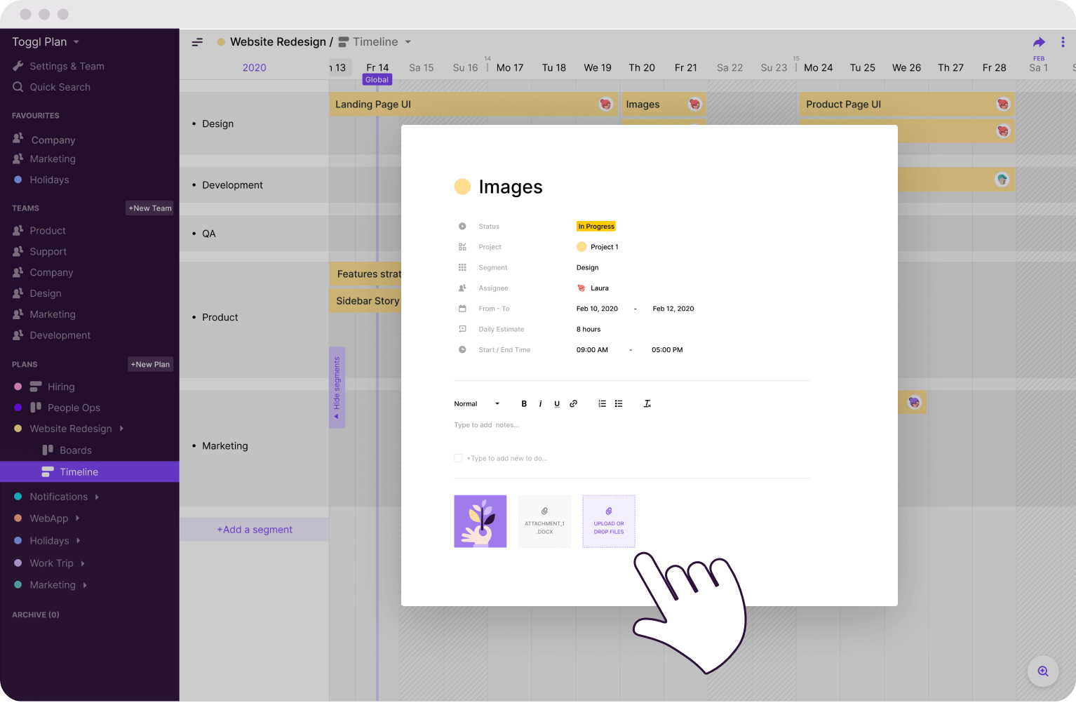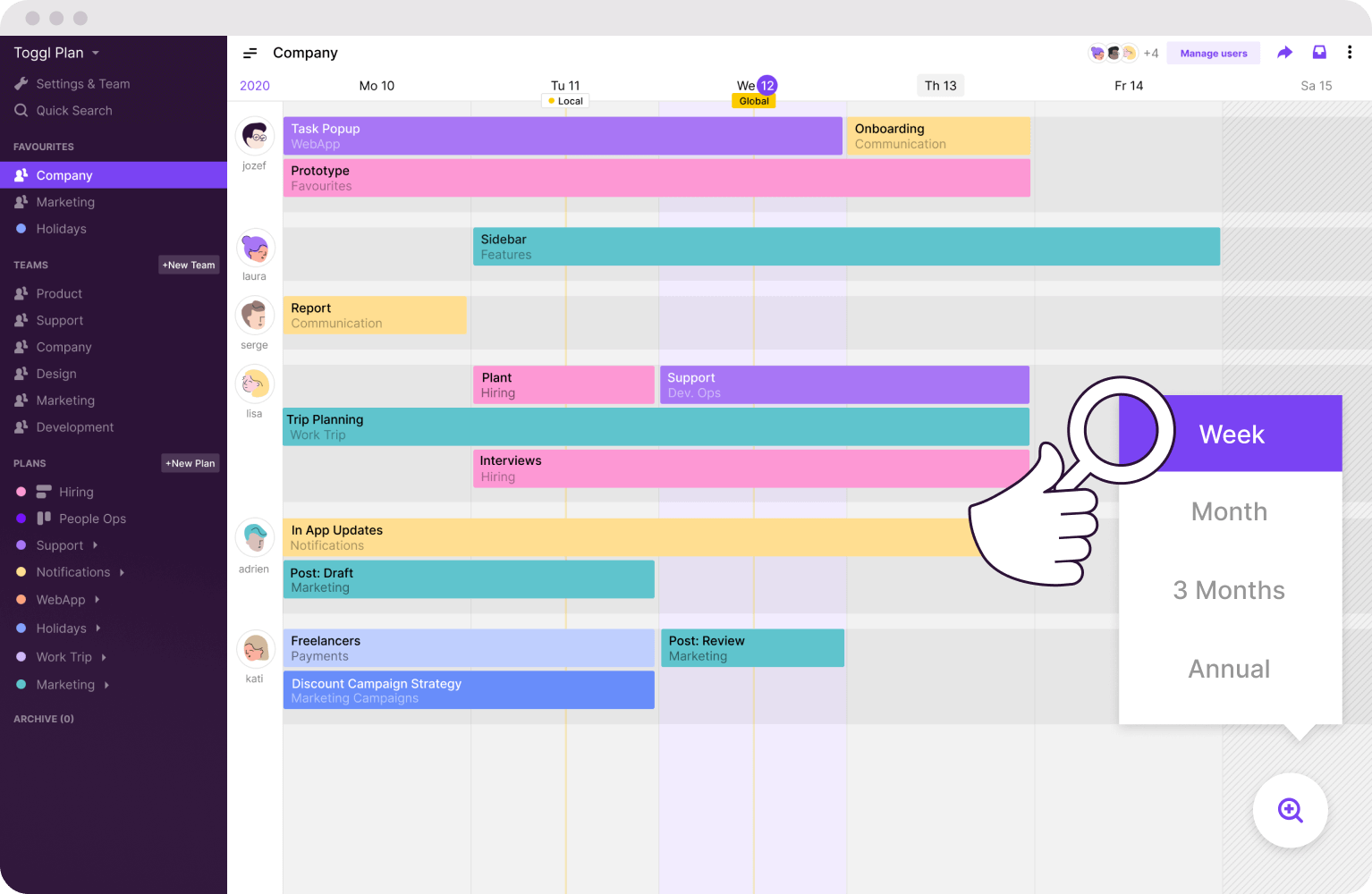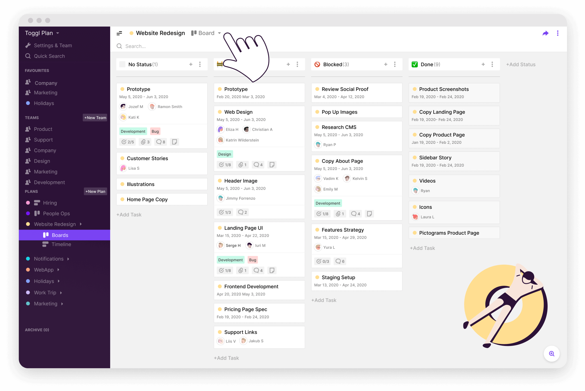 Toggl Plan lets you organize your work, check on a task’s status at a glance, and ensure nothing gets lost when you’re juggling dozens of projects. Whether you're planning for next week or your next big project, you'll have a clear visual overview of what needs to be done when.