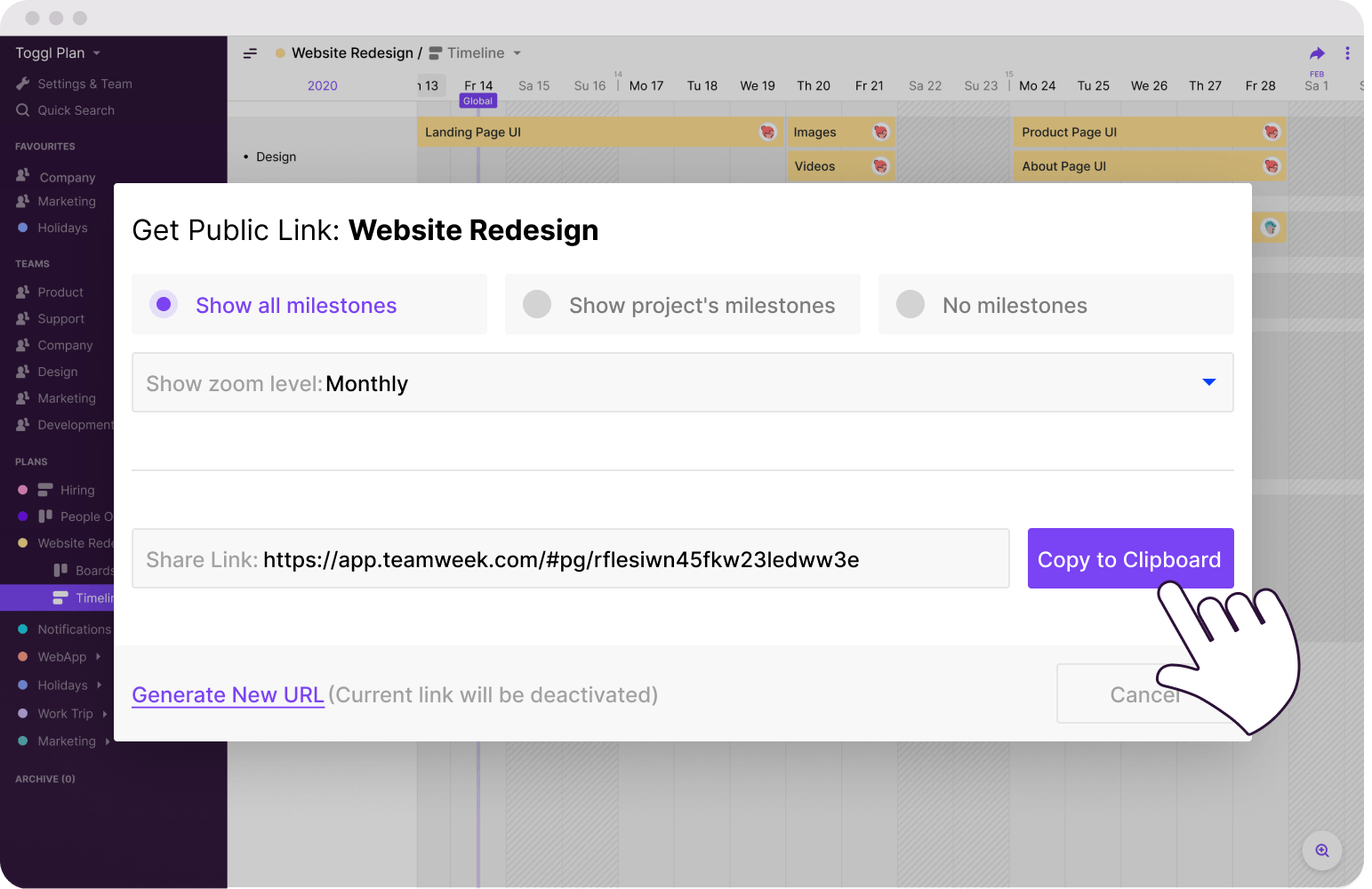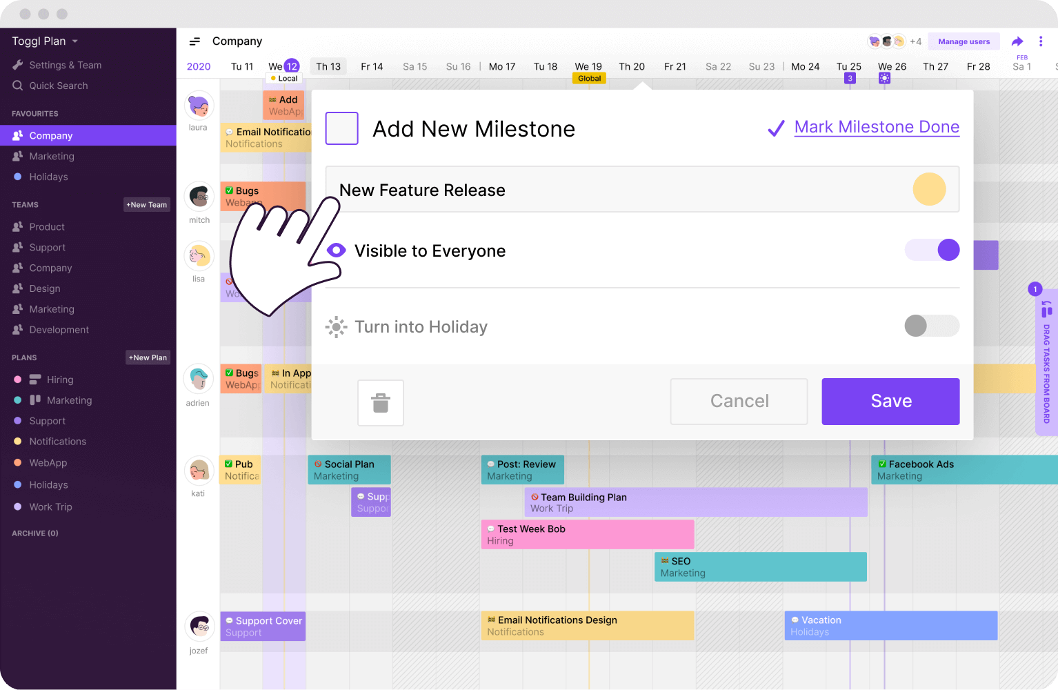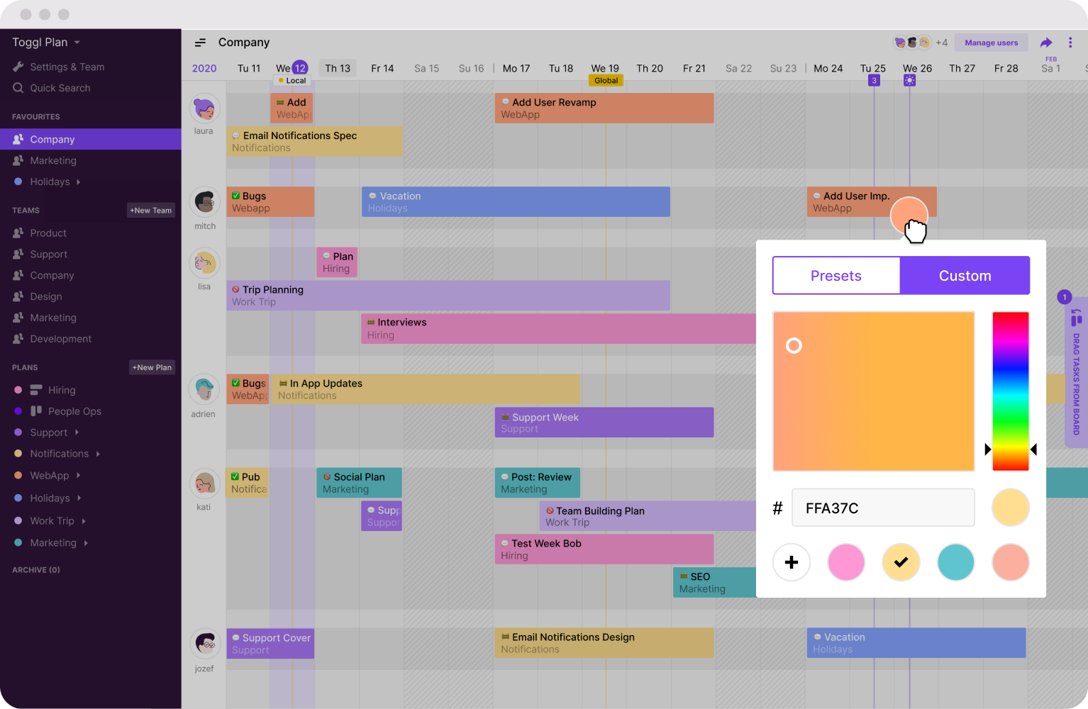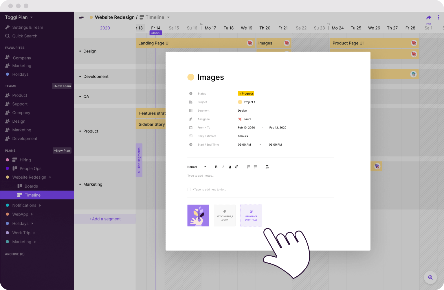 Toggl Plan lets you organize your work, check on a task’s status at a glance, and ensure nothing gets lost when you’re juggling dozens of projects. Whether you're planning for next week or your next big project, you'll have a clear visual overview of what needs to be done when.