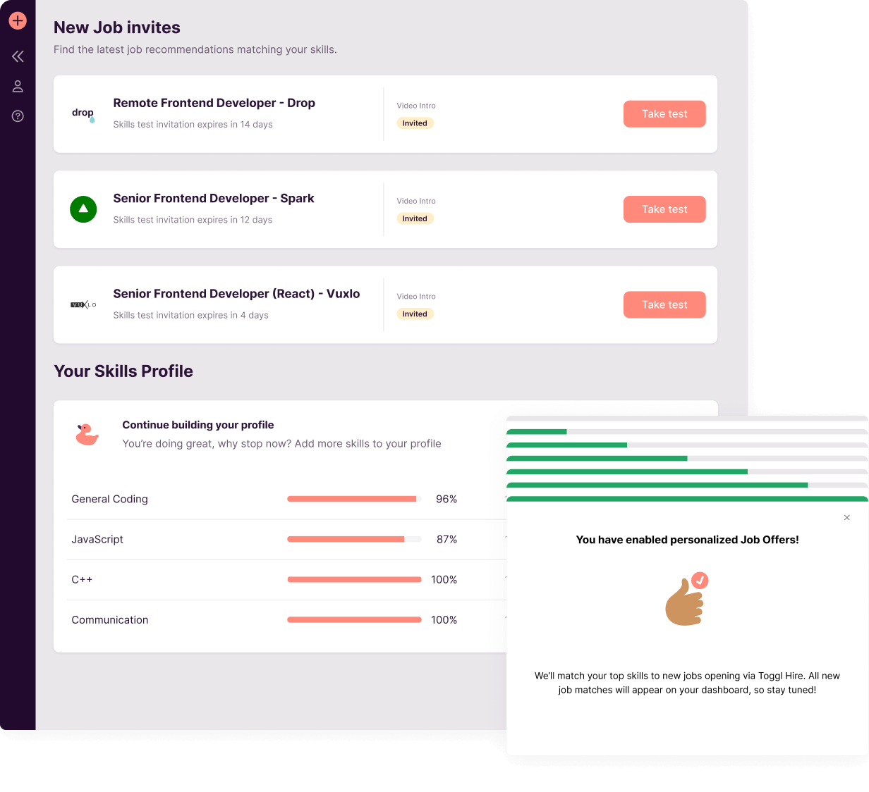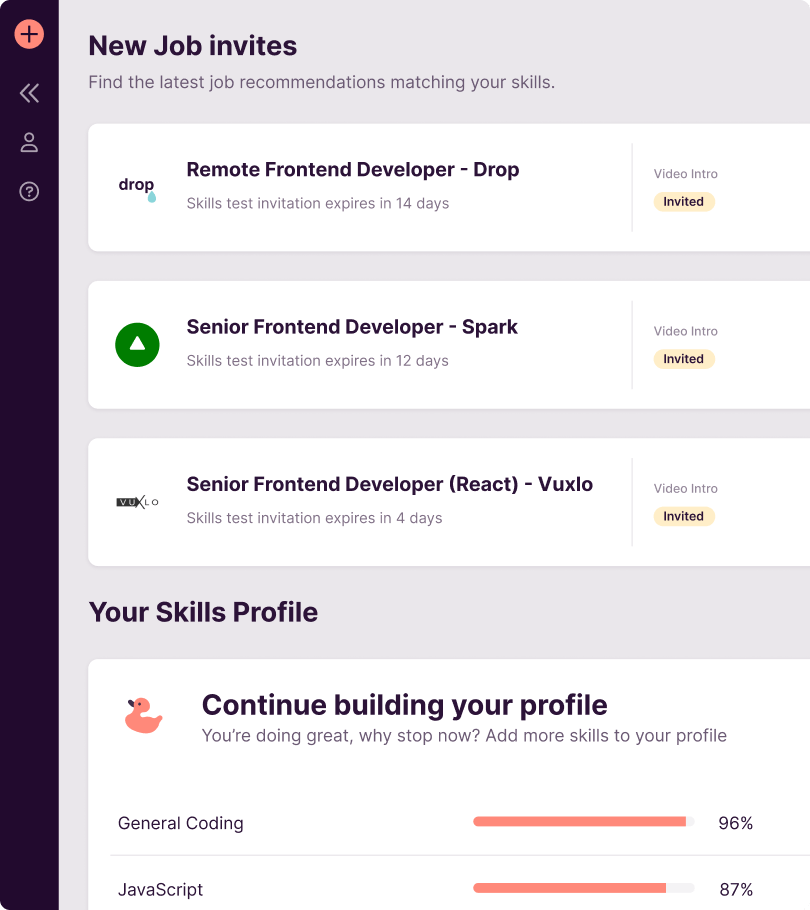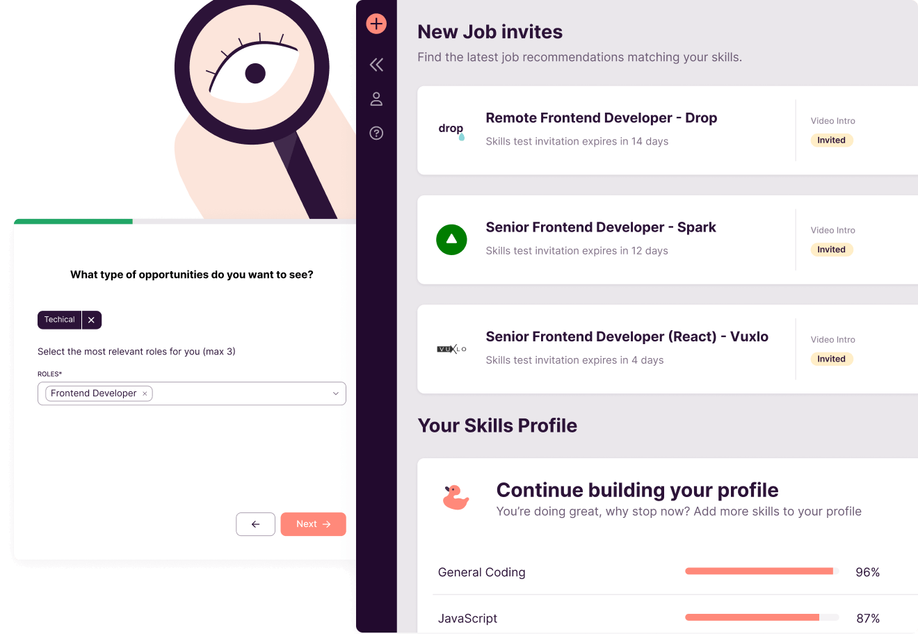 Complete short skills tests to find out your strongest skills. Build a skills profile and get matched with relevant jobs.