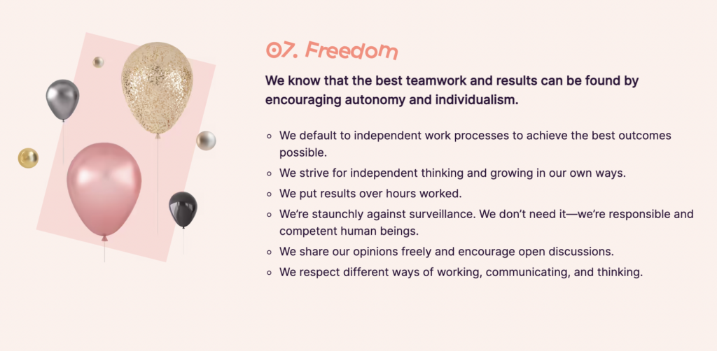 It’s not that these beliefs were explicitly named at Toggl Track as official values. It was just that I could see that they were present in our day-to-day work, and the way team members interacted with other team members.