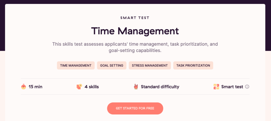 If organizational skills and meeting strict deadlines are super important to the role, include a time management skills test as part of the interview process. It helps assess applicants’ time management, task prioritization, and goal-setting capabilities.