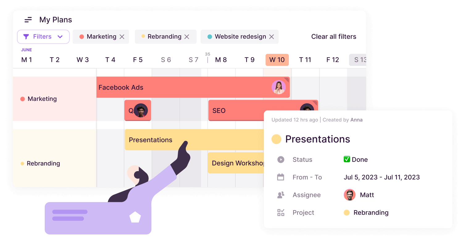 Delivering creative projects involves a lot of moving pieces. Spreadsheets are unreliable, and keeping project tools up to date can feel like a chore. With Toggl Plan, you can plan, prioritize, and track projects using simple, drag and drop timelines.