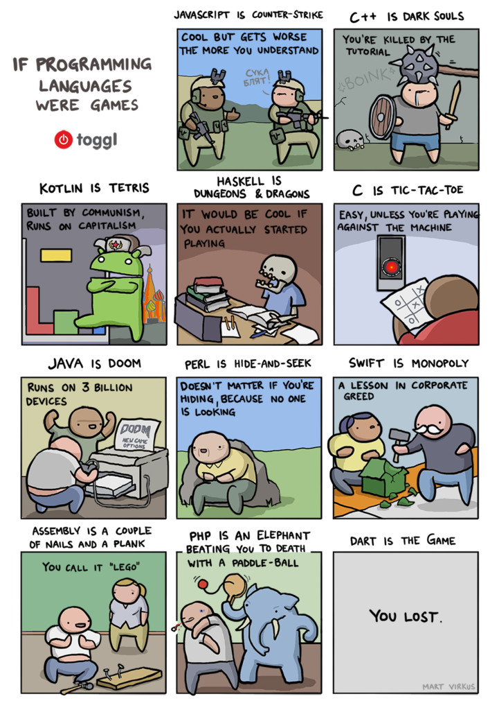 JavaScript is Counter-Strike. It looks cool at first but gets worse the more you understand it. At least the community is nice (because they understand each other’s pain).