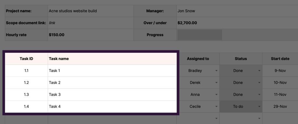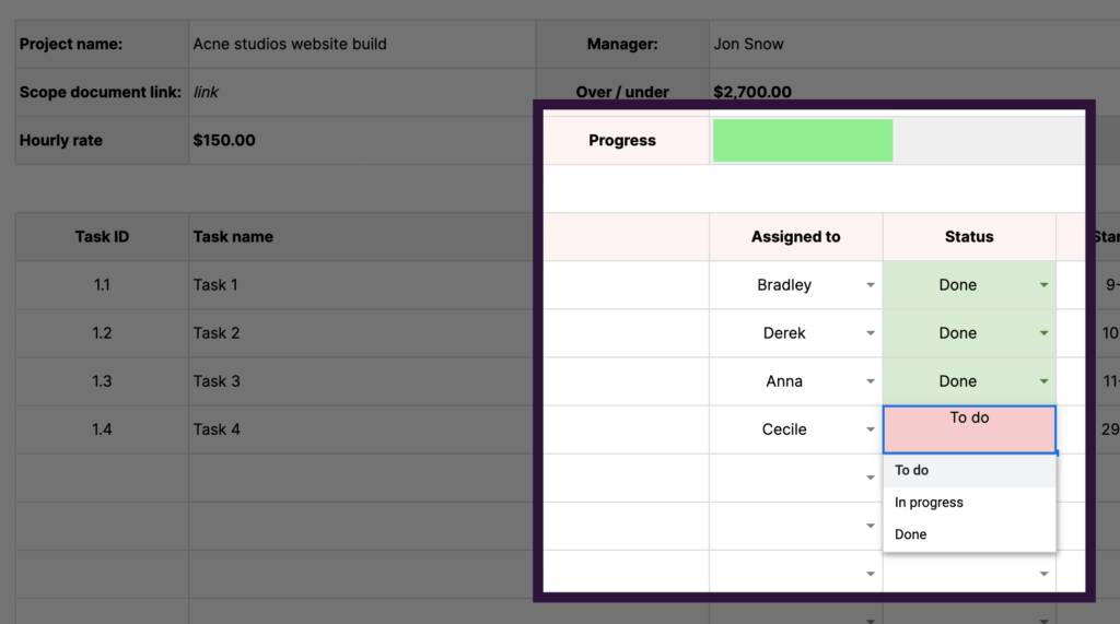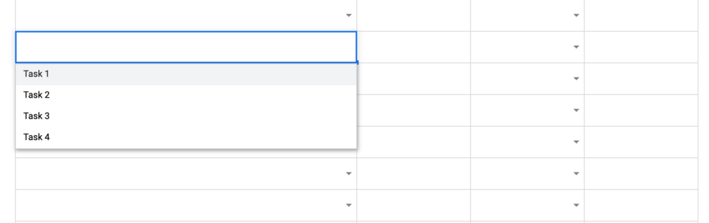 Note: The task dropdown inside the ‘Tracker’ tab automatically pulls in the tasks you entered in the ‘Budget’ tab.