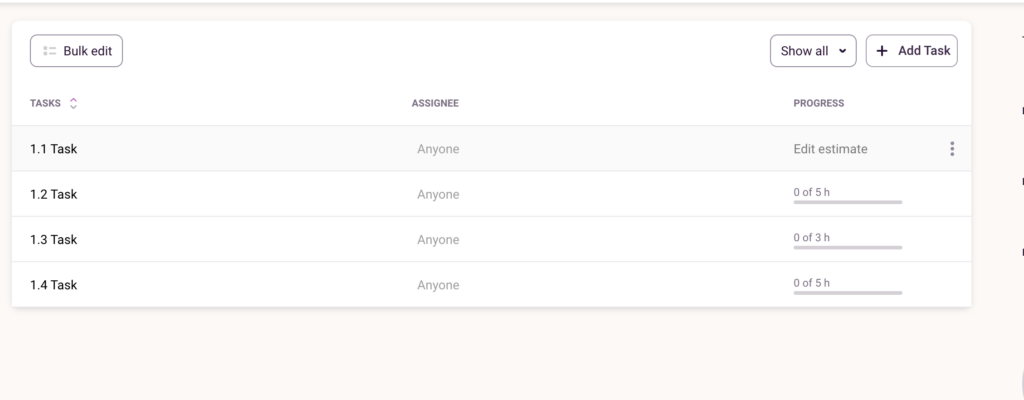 Add each project task and hit enter. Once you’ve added all tasks, you can add time estimates for each.