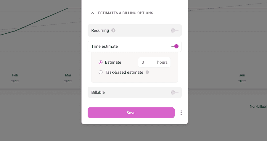 You can set up custom hourly time estimates for your projects or tasks and monitor actual hours vs the estimate inside of Toggl Track. Essentially this provides a budget of time for your projects. When paired with “Alerts,” you can trigger emails to relevant users based on hours tracked.