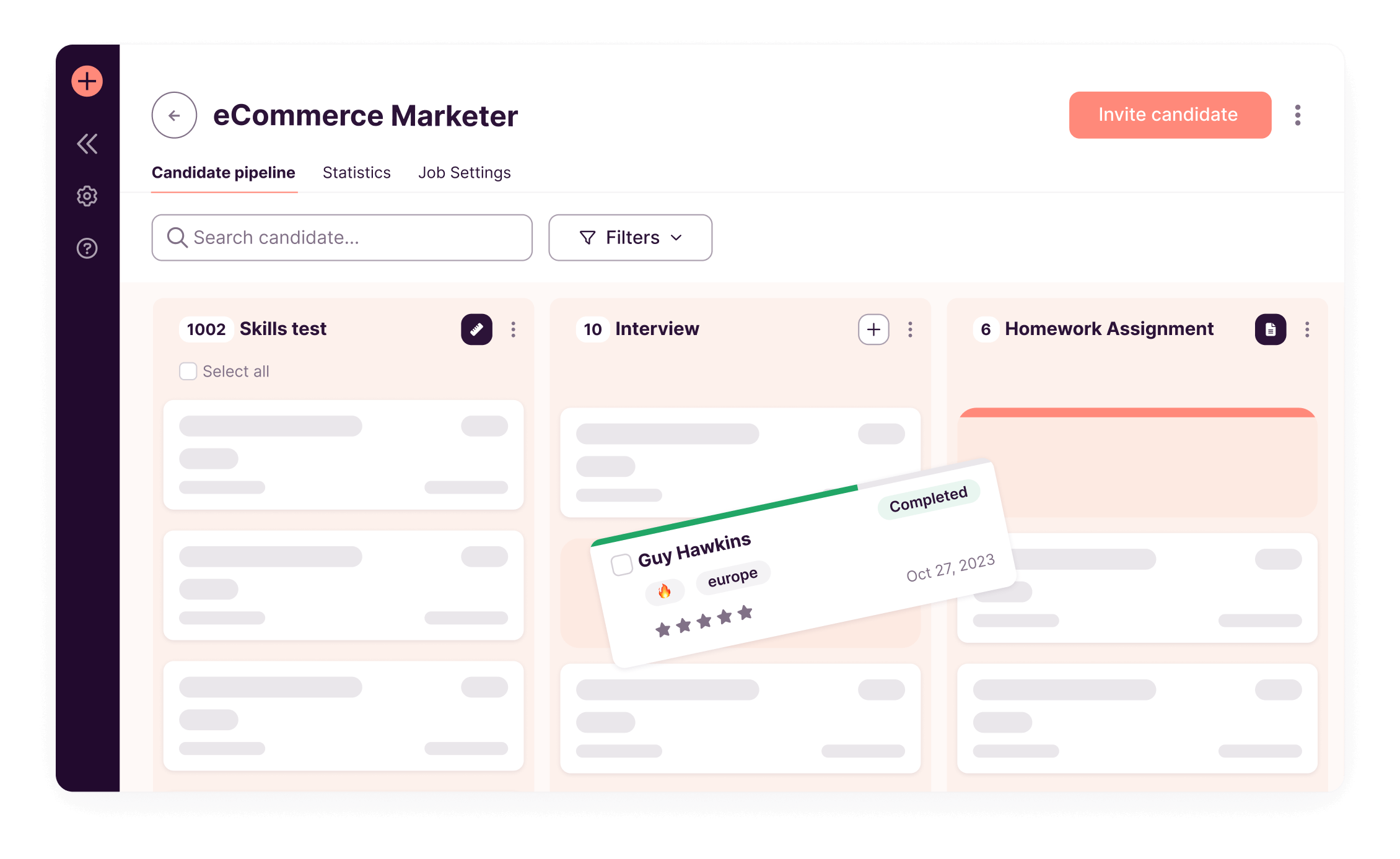 Declutter your mind (and your hiring process) with a visual applicant tracking pipeline. Track candidate status, send emails, leave notes and assign new assessments from one view.