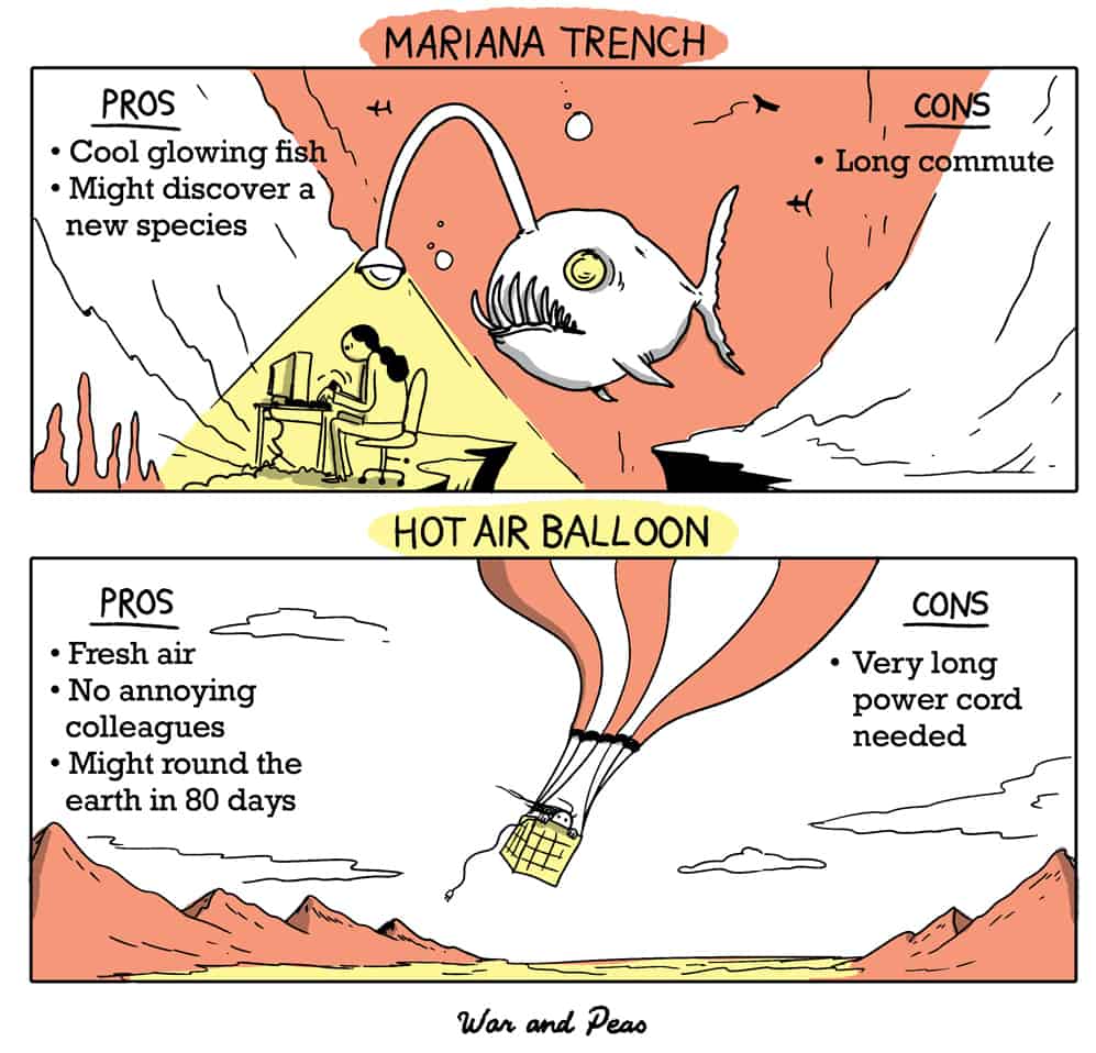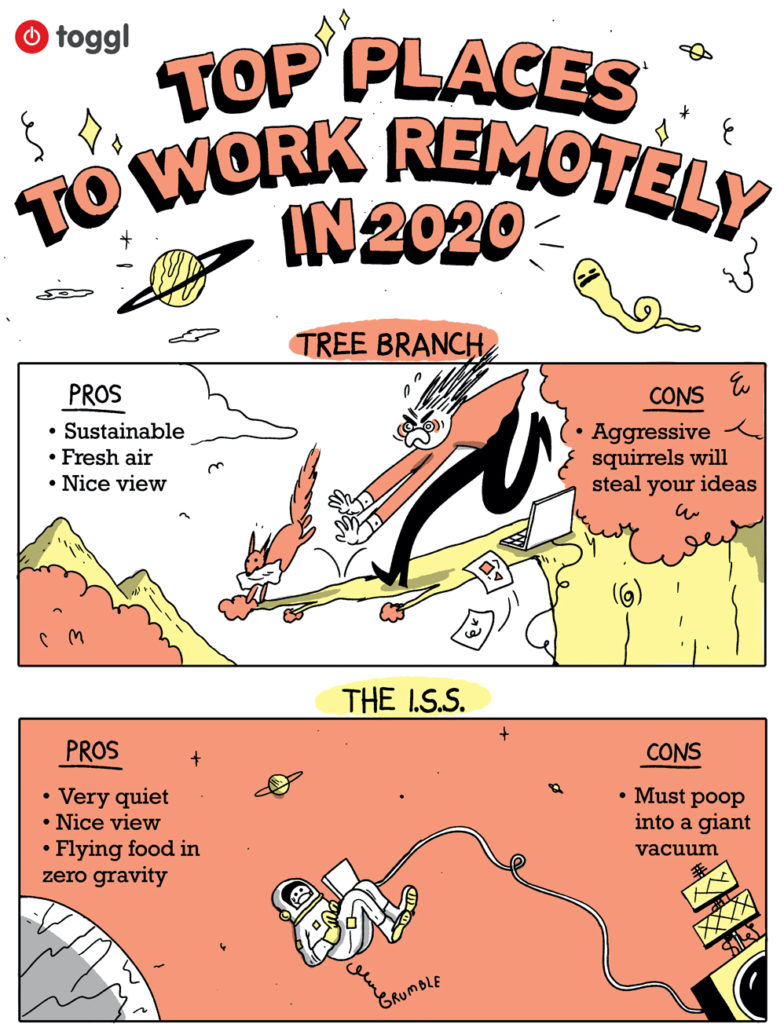Some of these remote workspaces–such as the afterlife–might not personally appeal to you. Maybe the wisdom of the deceased is not enough to make up for the unsolicited advice from your grandma. Other remote workspaces–such as the bear cave–might expand your idea of the possibilities for remote workspaces.