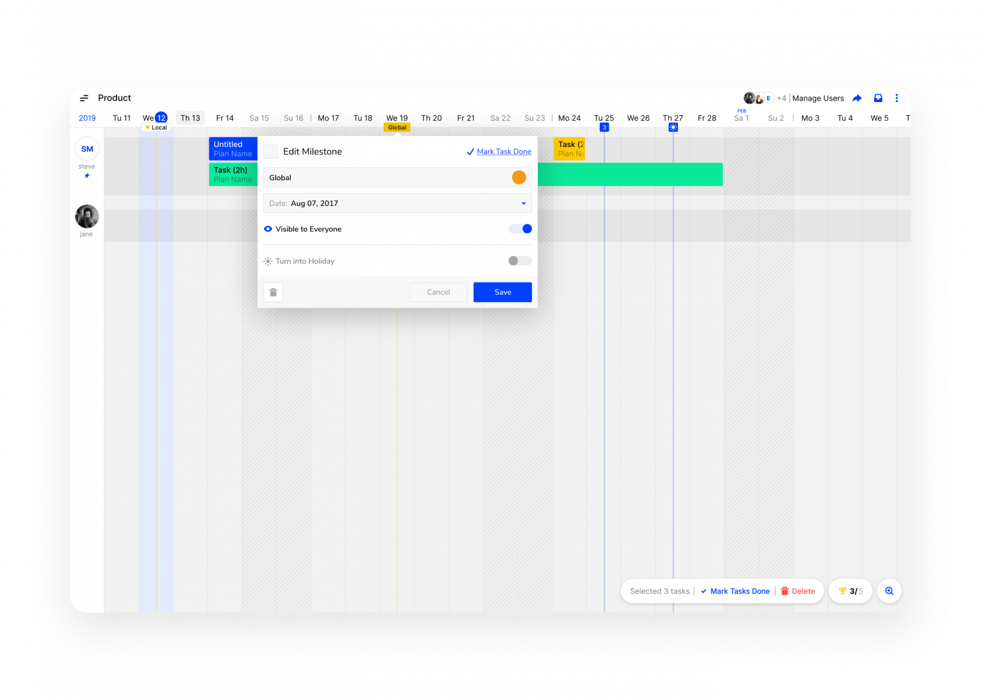 You can now create plan-based milestones that only show up on the plan you add them to. This way, you can be sure that all projects have relevant milestones attached and that if you decide to share your project with someone, only the milestones attached to the said project are visible to someone from outside your company.
