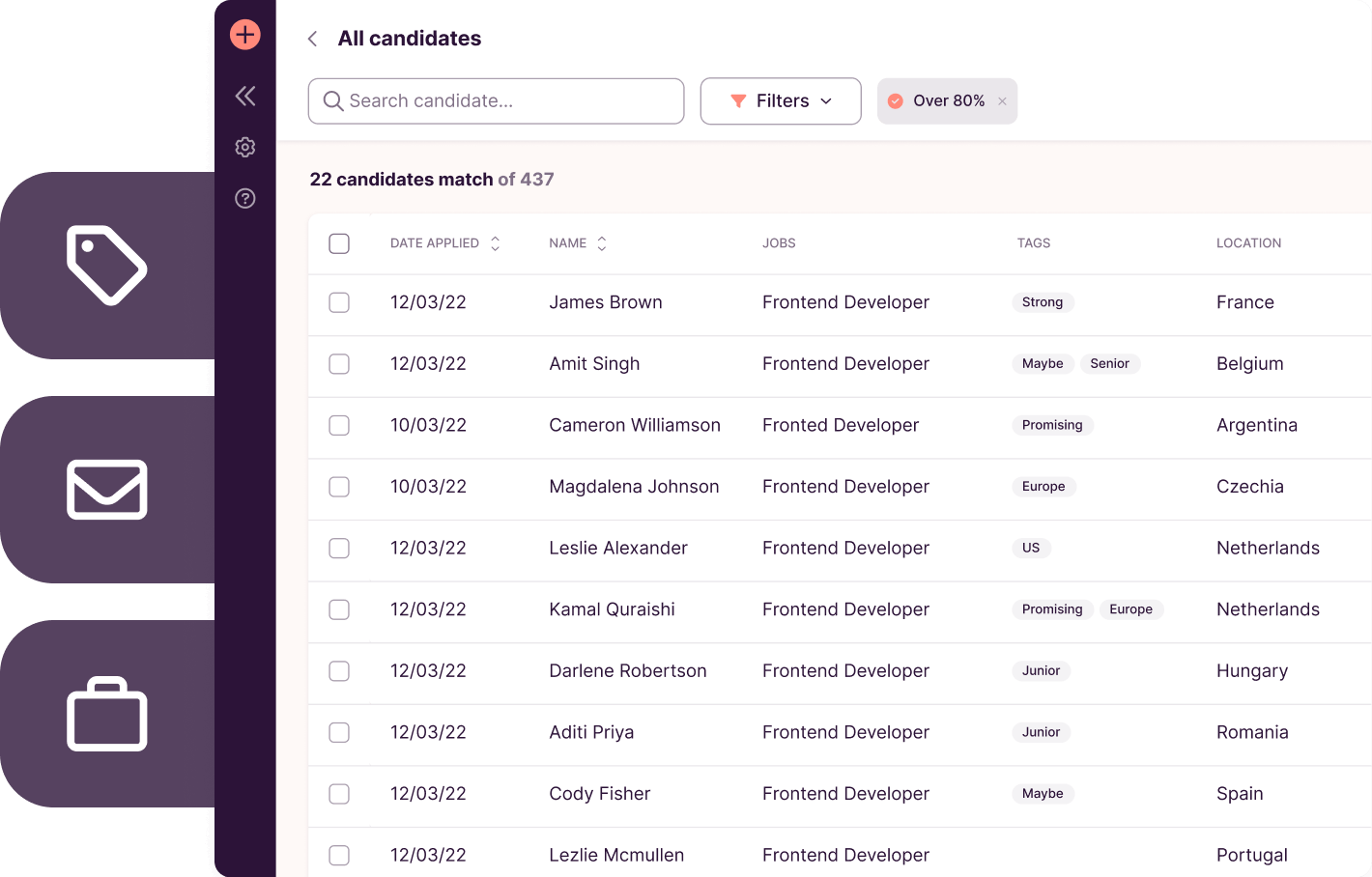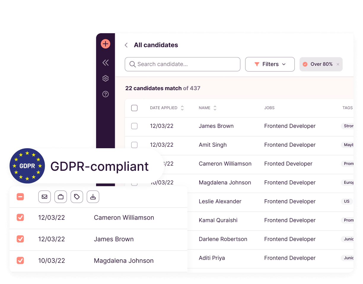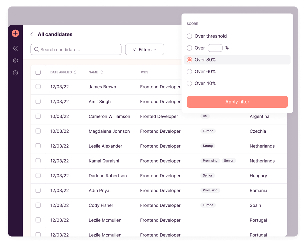 Welcome to your own treasure trove of qualified candidates. Toggl Hire automatically saves all past test takers in a private database that's all yours. Easily add new talent, update candidate records, and prune the list as needed. Your perfect hire is always just a few clicks away.
