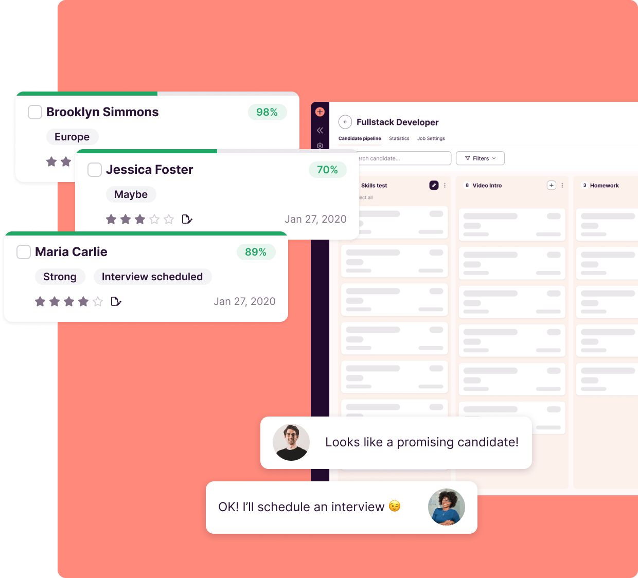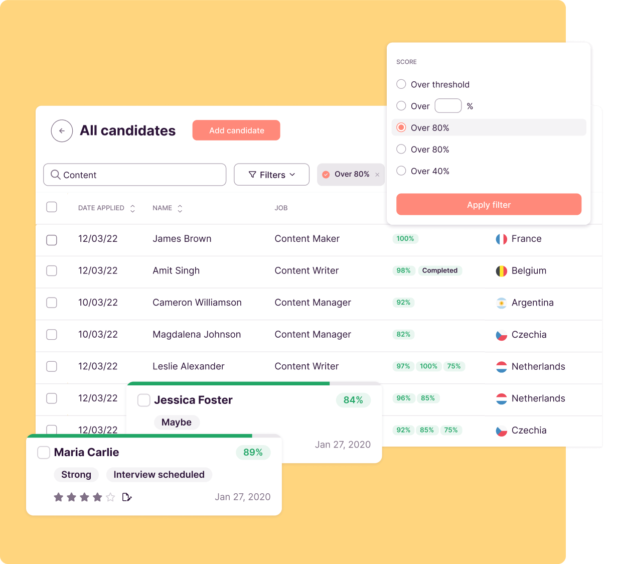 Yes. We want every step of your hiring process to work for you. Your hiring pipeline comes with multiple filters. You can filter and rank your candidates on their scores, tags, notes, and stars. While we'll give you suggestions, you can edit the score filter with the percentage of your choice. You can also add tags and use them to filter your candidates.