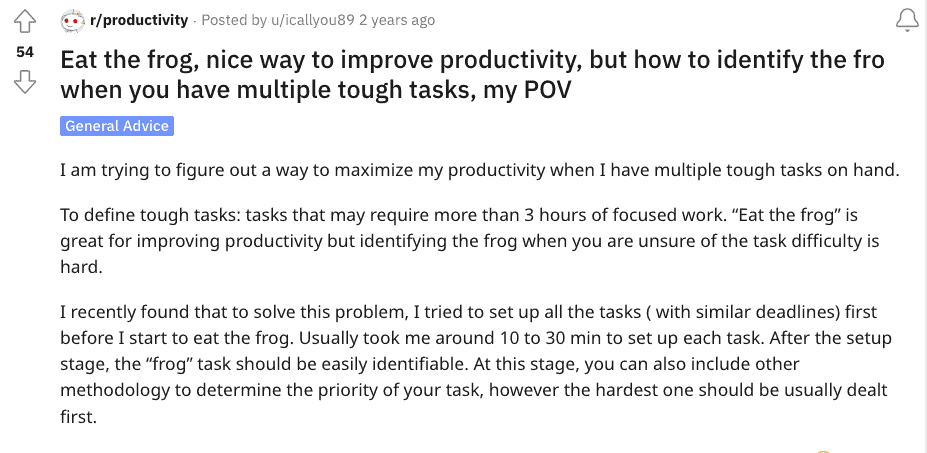- Rank your tasks: Based on the importance and difficulty, rank your tasks. The tasks that rank highest in both importance and difficulty are your “frogs.”