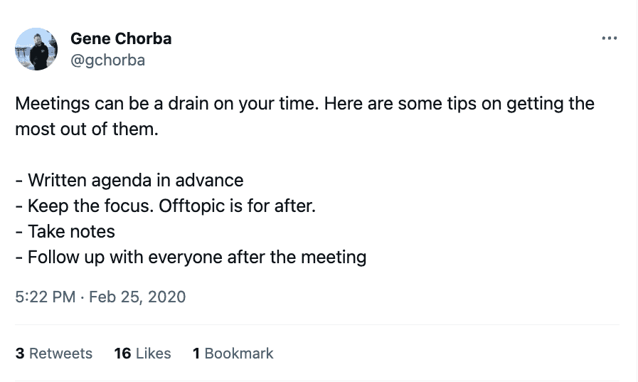 Go a step further and track the time you spend in meetings over a week or month. This practice will enable you to determine the proportion of time you dedicate to meetings compared to the revenue-generating work.