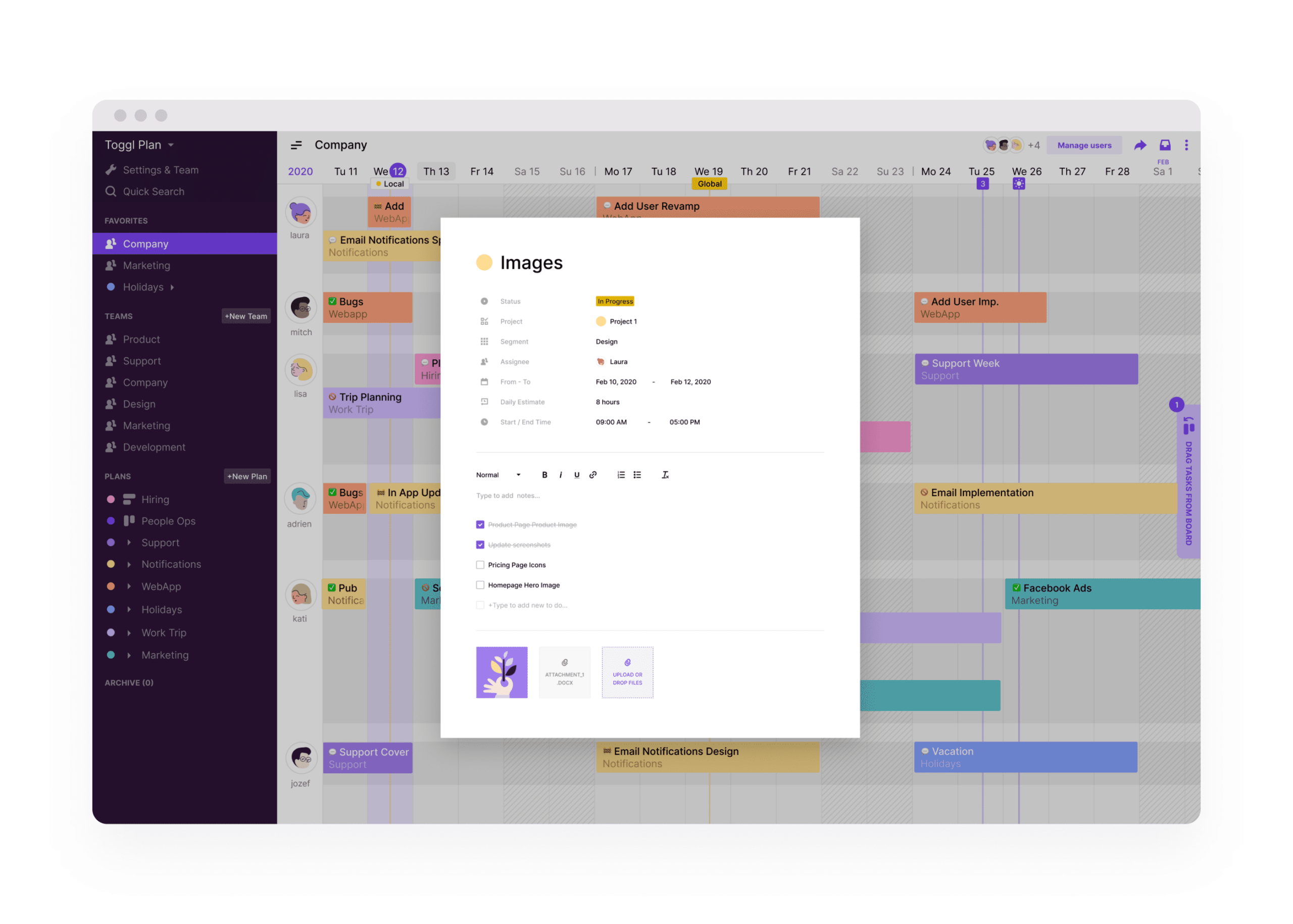Once you have everyone added to the timeline, start adding tasks. This is one of my FAVORITE Toggl Plan features: adding a task is as easy as pointing on the timeline and clicking. A pop-up box appears, allowing you to enter all relevant task details, such as an estimate of the hours it will take and any associated sub-tasks.