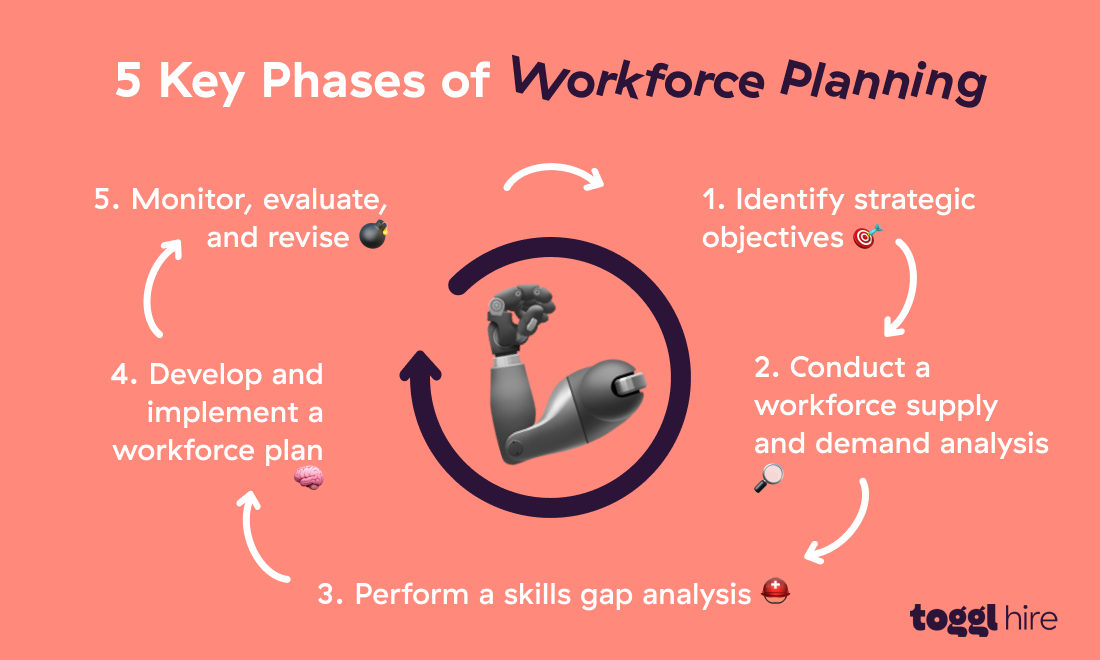 - The workforce planning process starts by identifying strategic goals. HR teams assess skills gaps and future scenarios. They develop a hiring plan and regularly evaluate the plan to ensure continuity over the long term.