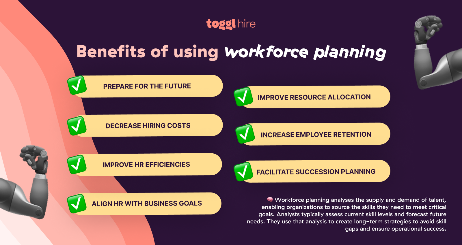 - Strategic workforce planning avoids future skills gaps, enables seamless transitions to new ways of working, decreases hiring costs (and the cost of repeated hires), and aligns HR activity with strategic business goals.